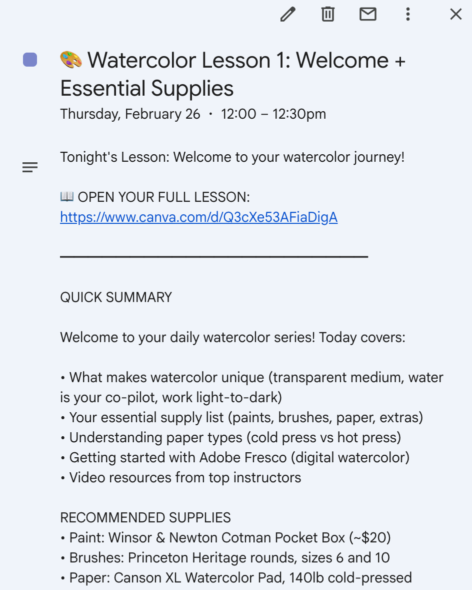 /Schedule every day, create a short watercolor painting lesson (3-5 minutes to read) in a Google doc and add it to my Calendar at 12:00 PM local time. [add any specific requests on structure, ability level, etc, OR ask Claude to interview you first to perfect the instructions for the task]